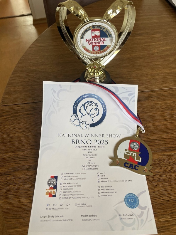 Orin – Dragon Fire & Blood Niarra nastoupil do třídy vítězů, kde v konkurenci čtyř dalších vítězů obsadil 1. místo. V následujícím boji o nejkrásnějšího psa plemene také zvítězil a nakonec si odnesl krásné ocenění Výborný 1, CAC, Nejlepší dospělý pes a BOS! Orinek tímto navíc splnil podmínky pro udělení titulu český grand šampion krásy! O perfektní předvedení Orina se postarala Hanička Vacířová, které tímto ještě jednou srdečně děkuji.