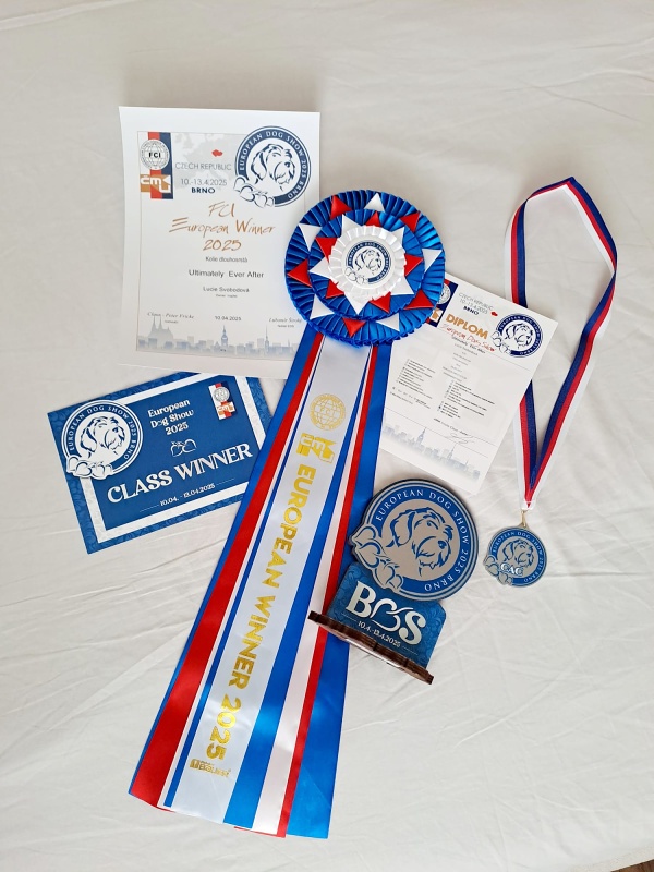 Thorvi nastoupila do kruhu po 2,5 leté pauze a předvedla se jako vždy - s elegancí a zároveň s tou svou typickou zdravou „drzostí“, kterou má větší než celý výstavní kruh :D Pan rozhodčí ji shledal jako nejlepší fenu ve třídě a Thorvi tak získala již svůj druhý CAC z evropské výstavy! Jenže tím to nekončilo! Pro mě ABSOLUTNĚ nečekaně zvítězila i mezi fenami celkově a získala i tituly CACIB, EVROPSKÝ VÍTĚZ a BOS!!! Neskutečný úspěch, o kterém se mi nikdy ani nesnilo a ano, byly i slzy dojetí! Podotýkám, že Thorvi v den konání výstavy bylo téměř 8 let, což je hranice pro třídu veteránů a i přes to z ní v kruhu čišela energie jako vždy. Ba dokonce možná i víc než kdy předtím. Ona je prostě jedinečná.
